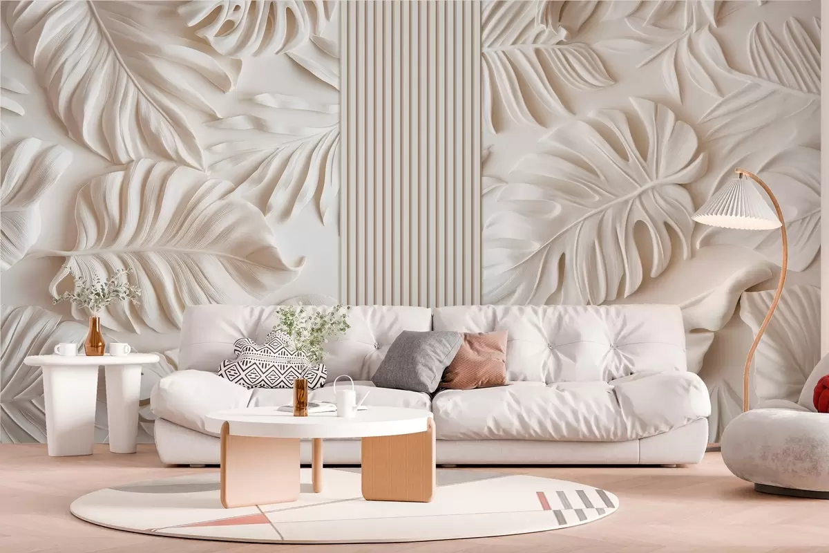 Fototapetak nagy trópusi levelek utánzata dombormű és panelek világos színekben Nr. w03119