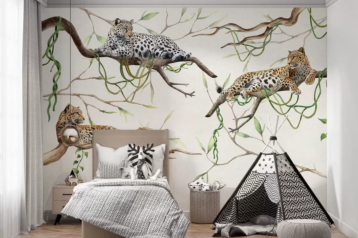 Fototapetak Leopárdok a dzsungel fáin, liánok, trópusi, vadállatok, természetes színpaletta Nr. w03146