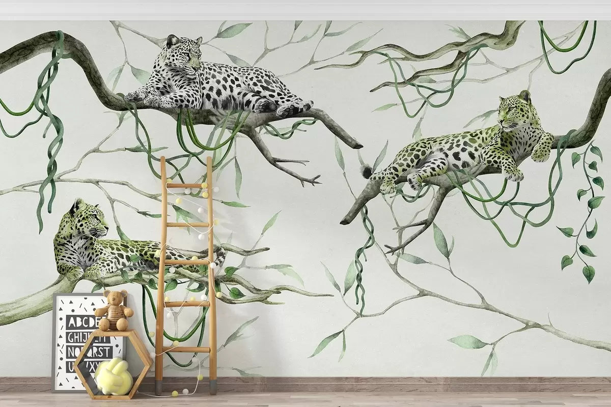 Fototapetak Leopárdok a dzsungel fáin, liánok, trópusi, vadon élő állatok, zöld színpaletta Nr. w03146v1