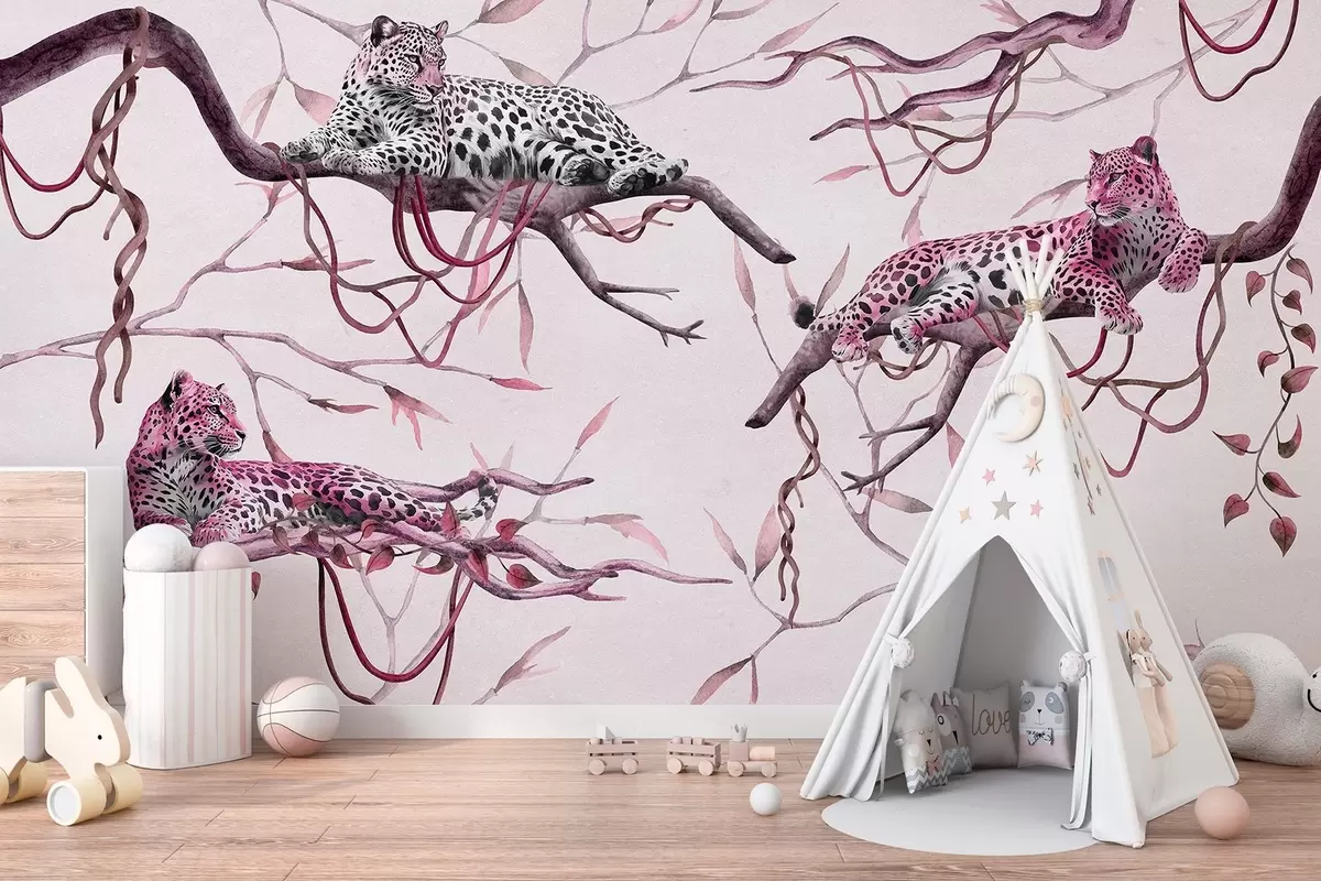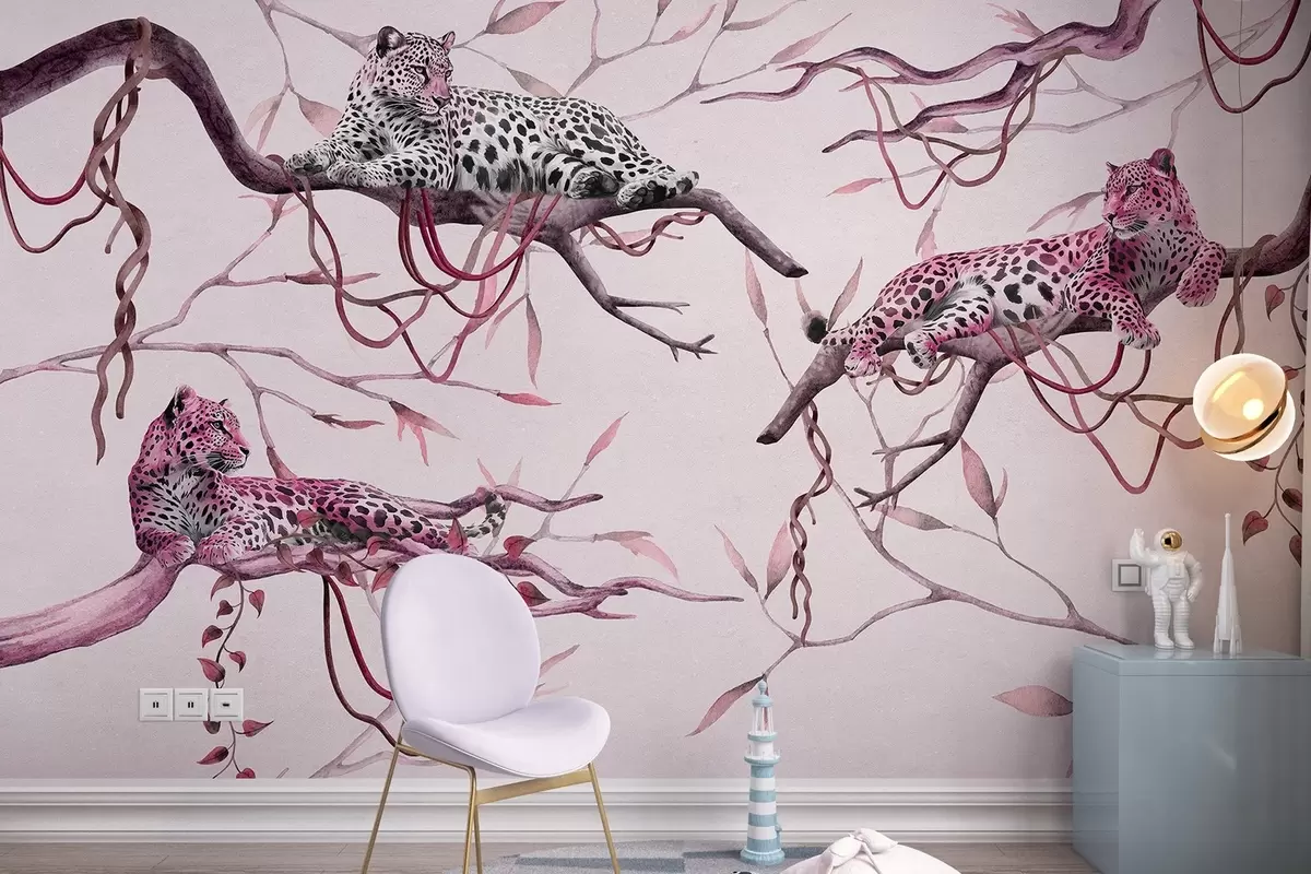 Fototapetak Leopárdok a dzsungel fáin, liánok, trópusi, vadállatok, rózsaszín színpaletta Nr. w03146v2