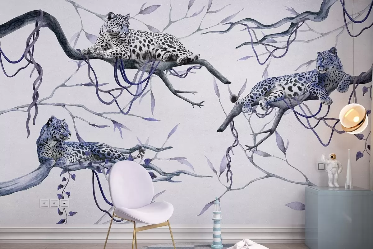 Fototapetak Leopárdok a dzsungel fáin, liánok, trópusi, vadon élő állatok, lila színpaletta Nr. w03146v3