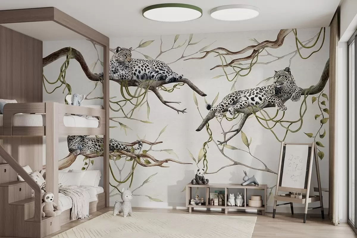 Fototapetak Leopárdok a dzsungel fáin, liánok, trópusi, vadállatok, pasztell színpaletta Nr. w03146v4