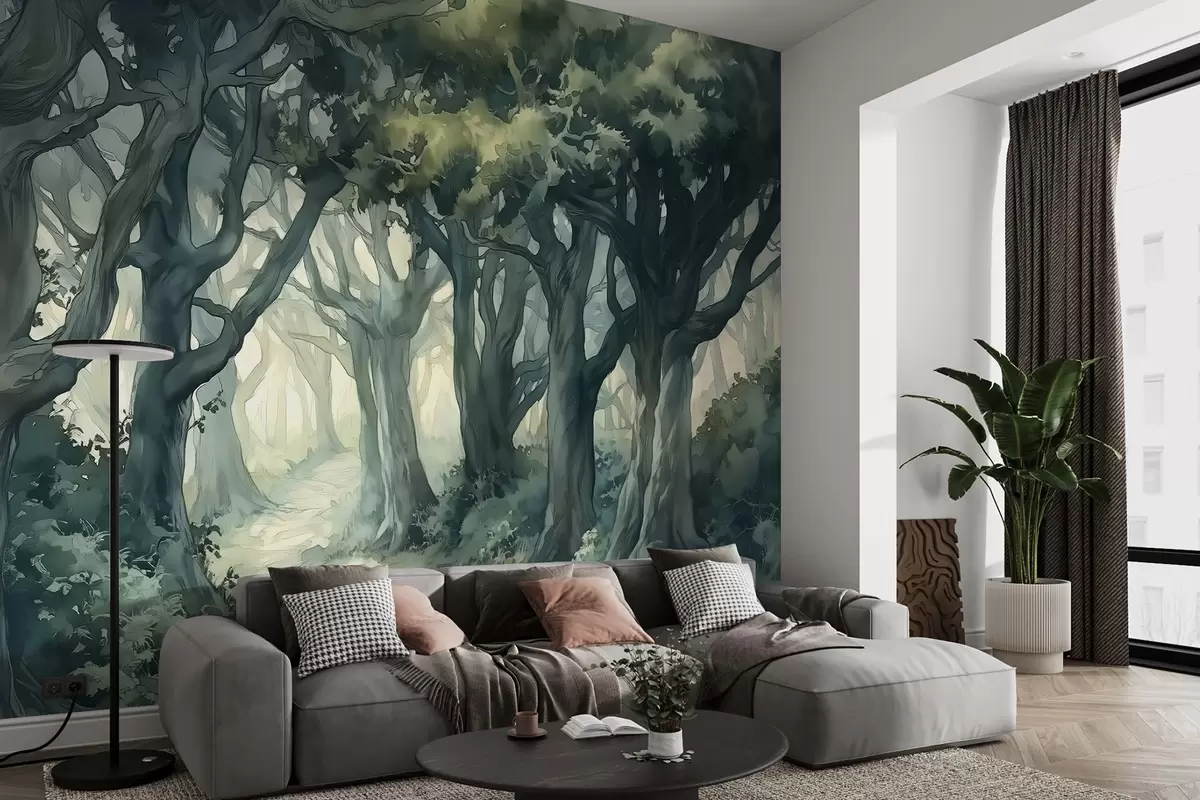 Fototapetak Erdő nagy fákkal, zöld színű spaletta, akvarell stílusú rajz Nr. w03150