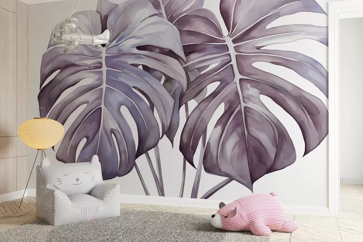 Fototapetak Nagy monstera levelek, trópusi növények, akvarell stílusú rajz, ibolyaszínű színek Nr. w03151v1