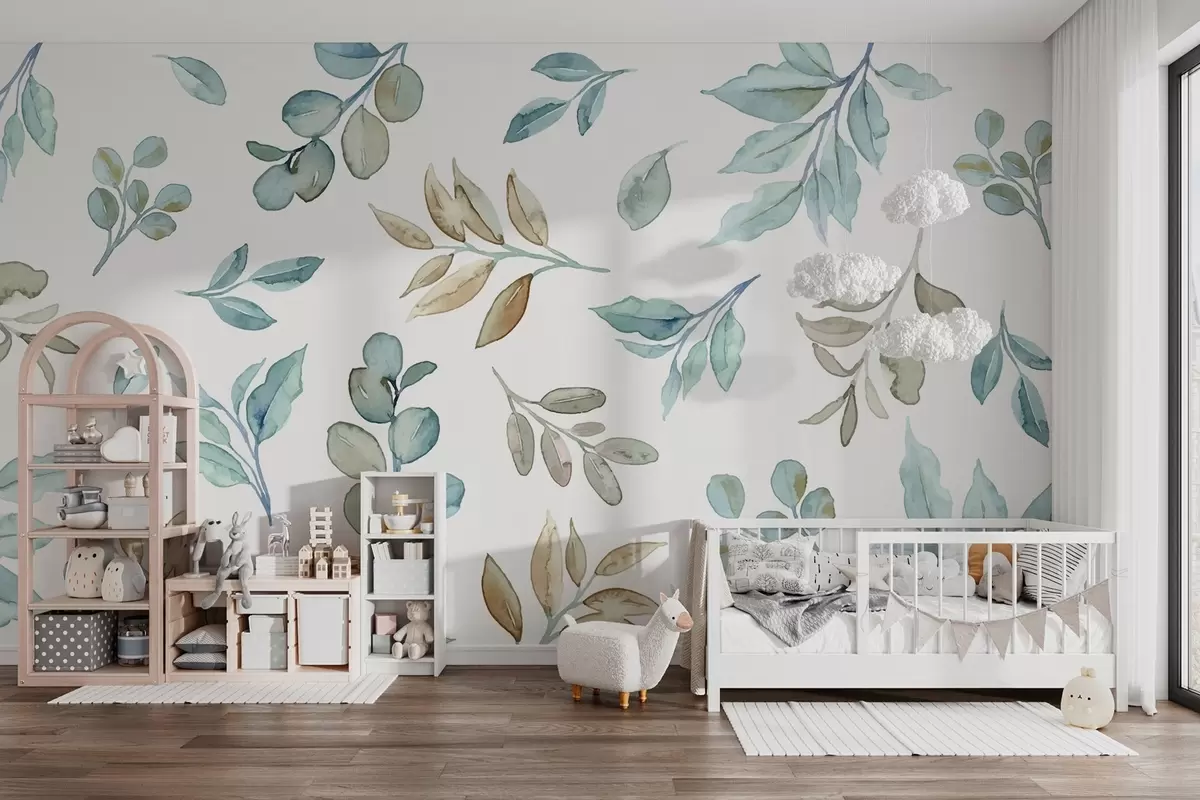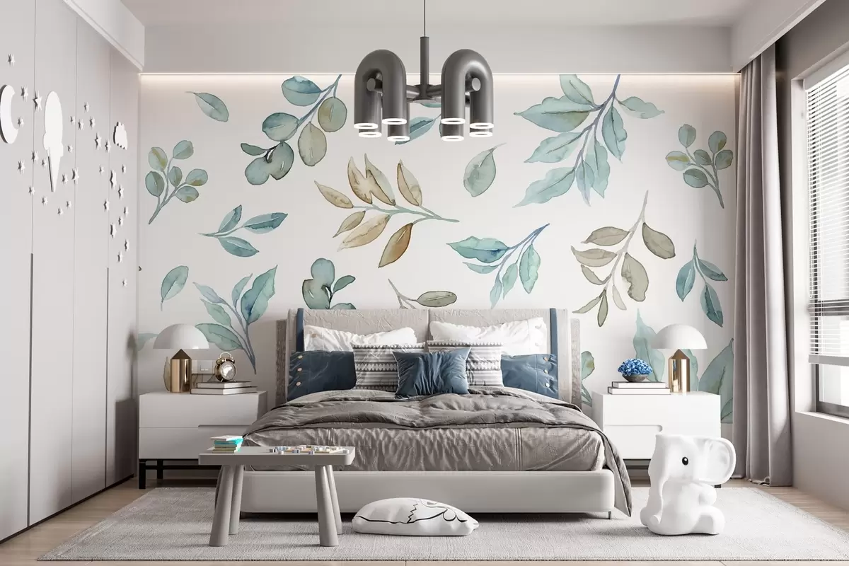 Fototapetak különböző levelek és ágak akvarell technikával, kék és bézs tónusokban, fehér alapon Nr. w03280