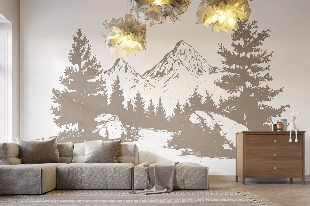 Fototapetak Az Alpok, hegyek erdővel, vonalas rajz, bézs színű Nr. w03342