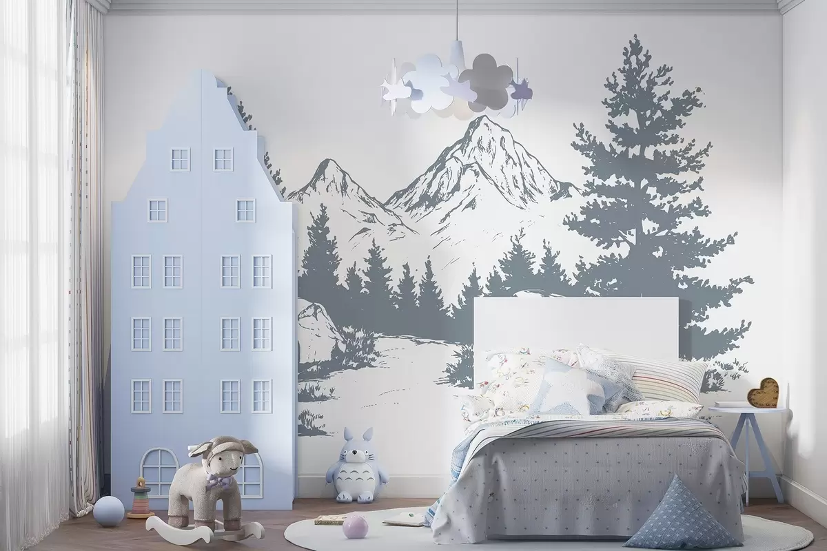 Fototapetak Alpok, hegyek erdővel, vonalas rajz, szürke szín Nr. w03342v2