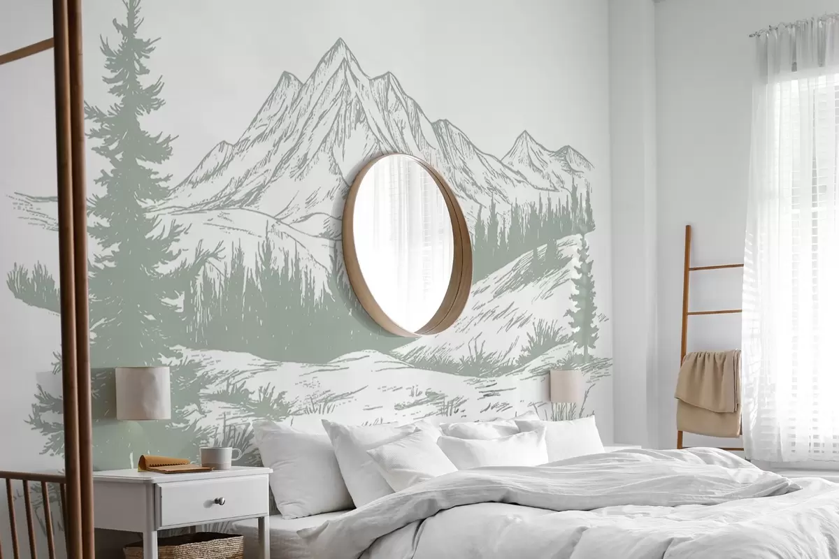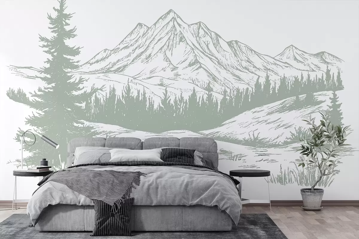 Fototapetak Hegyek táj fenyőfákkal, erdő, természet, lágy zöld színű Nr. w03344v1