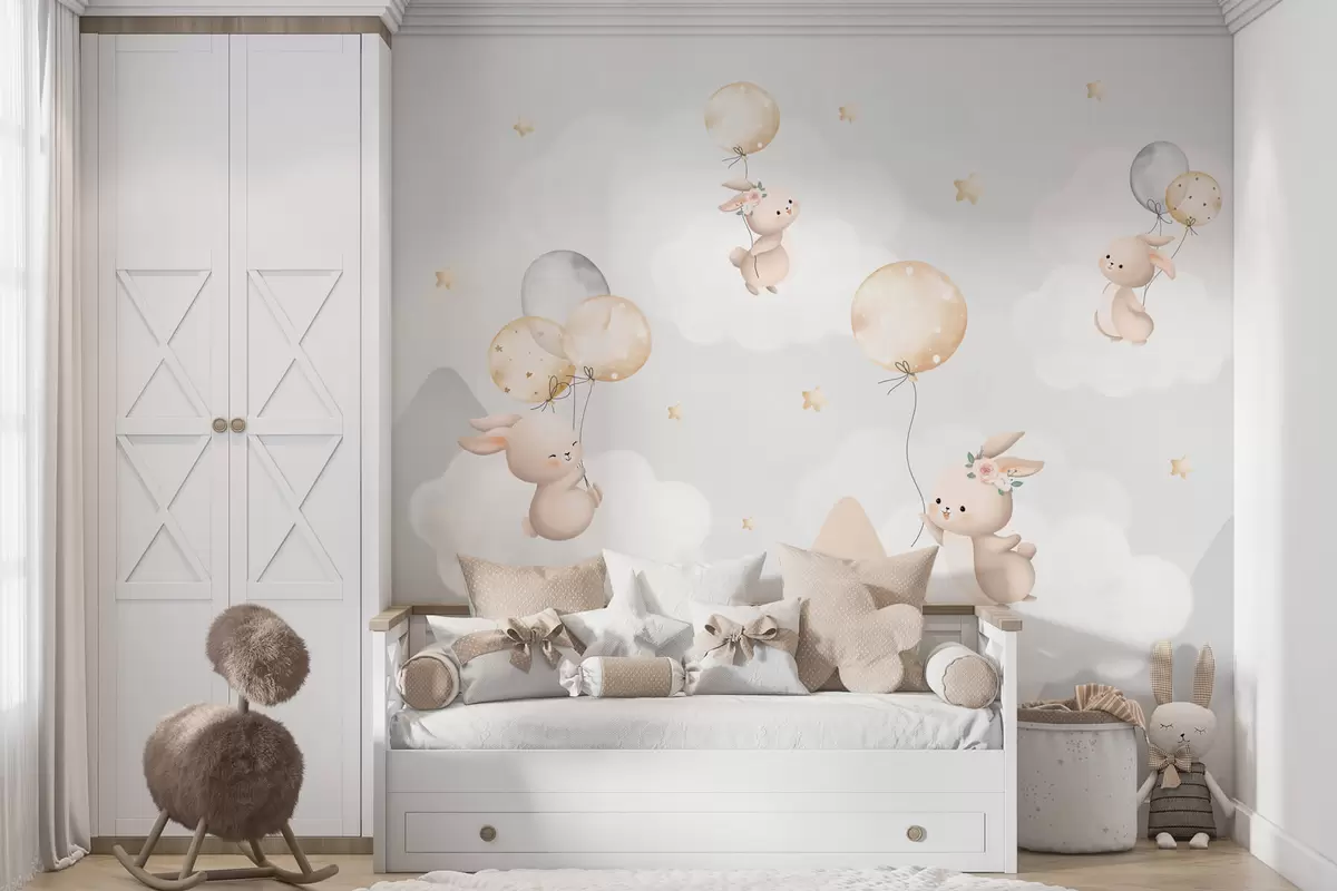 Fototapetak Nyuszik léggömbökkel a felhőkön a hegycsúcsok között Nr. w03375v1