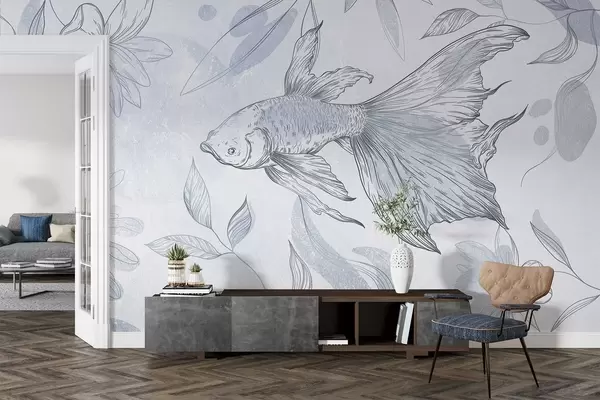 Fototapetak Halak virágos elemekkel, kék háttér, vonalas rajz Nr. w03517v2