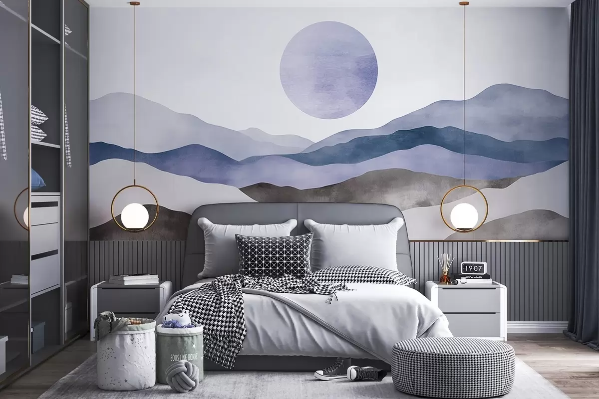 Fototapetak Akvarell hegyek a Nappal, boho stílusban, lila, kék, szürke Nr. w03551v1