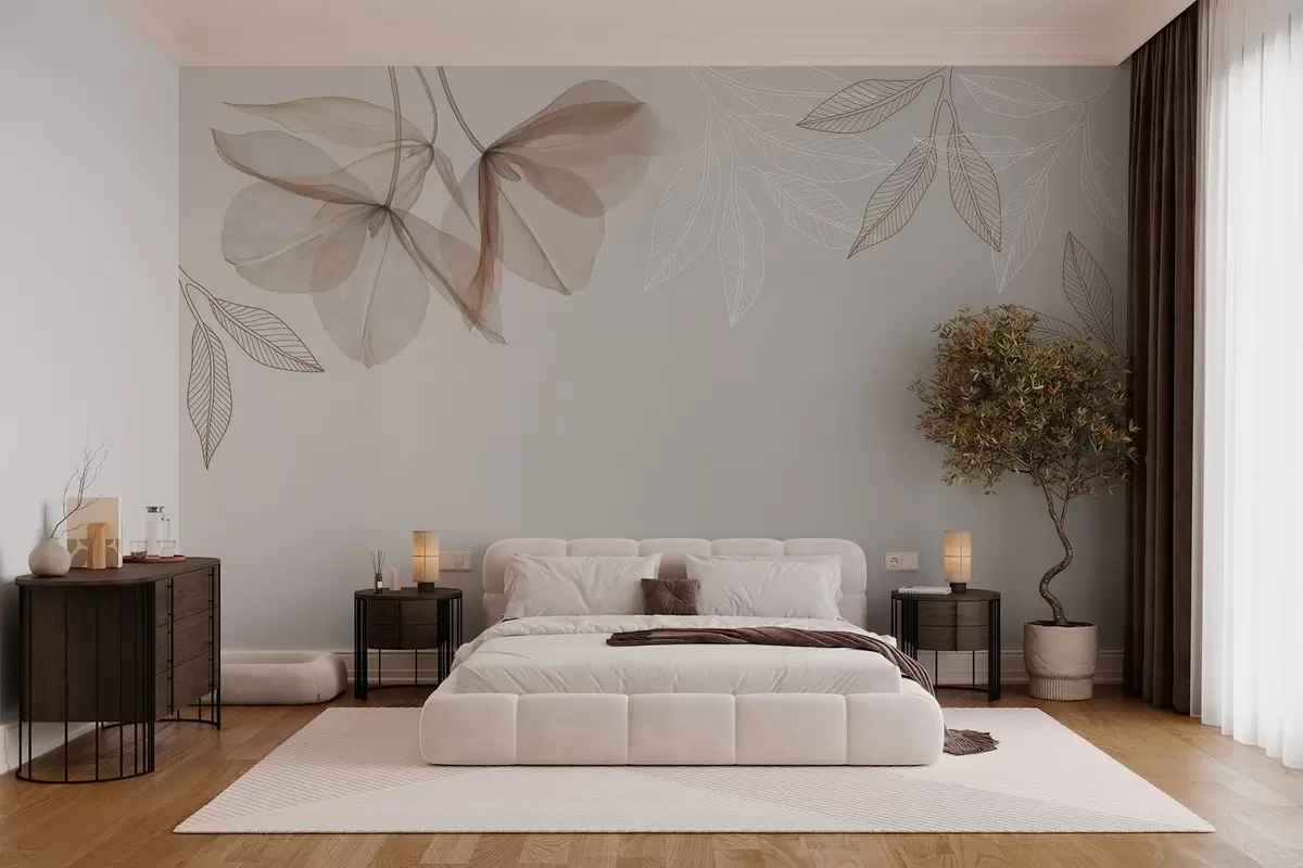 Fototapetak finom, áttetsző virágok és levelek mokka árnyalatban Nr. w03616v3