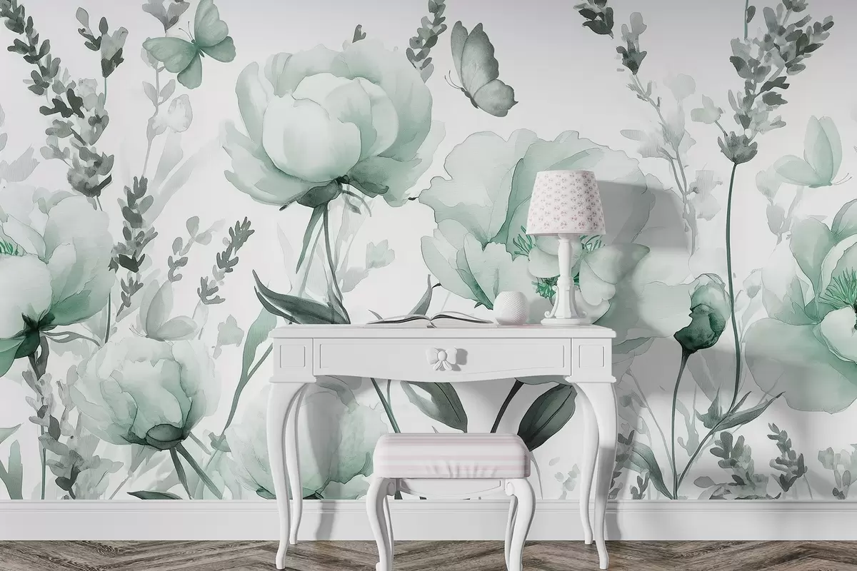 Fototapetak Virágos rét, bazsarózsa, levendula, pillangók, akvarell stílus, zöld színek Nr. w03668v1