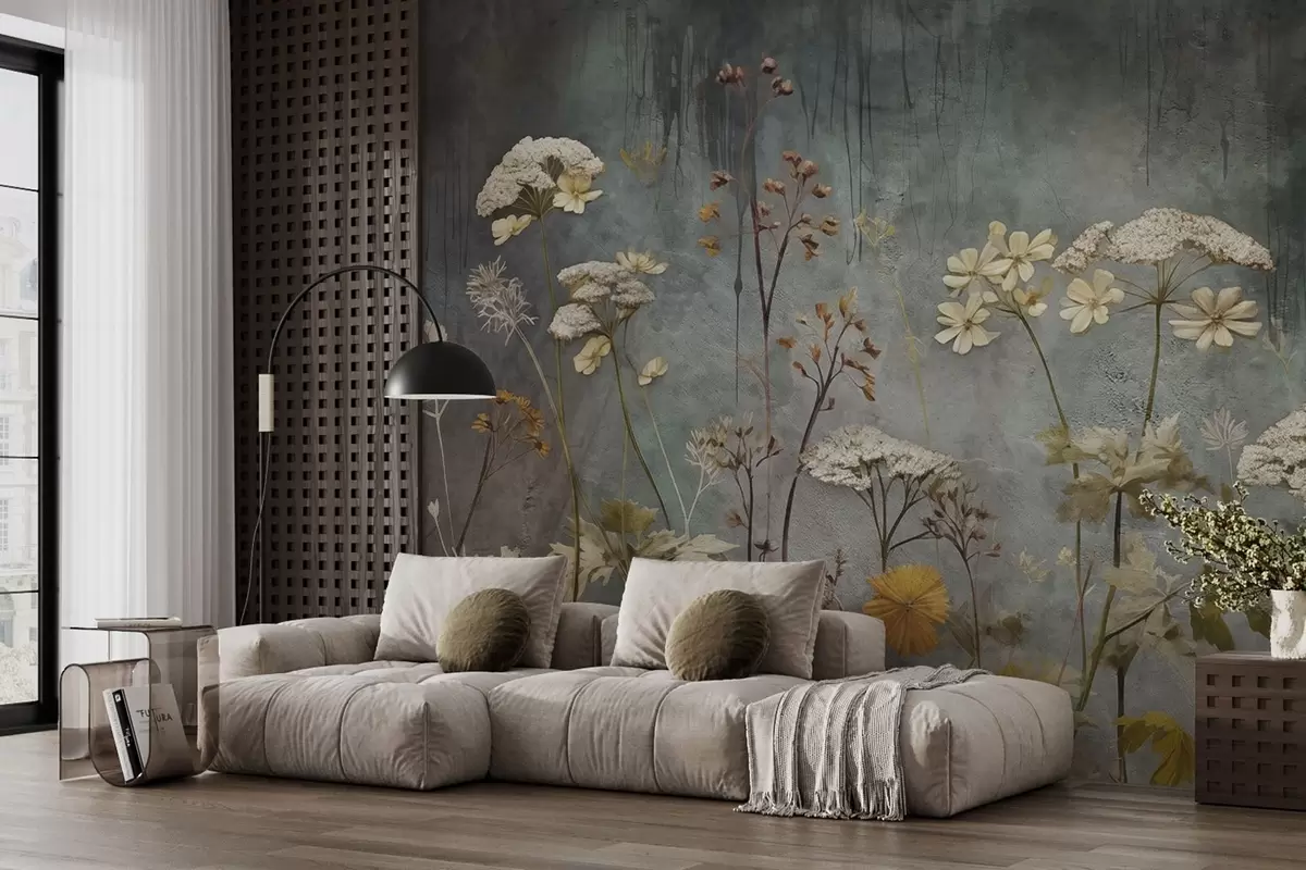 Fototapetak Vadvirágok és füvek a grunge fal hátterében Nr. w03697