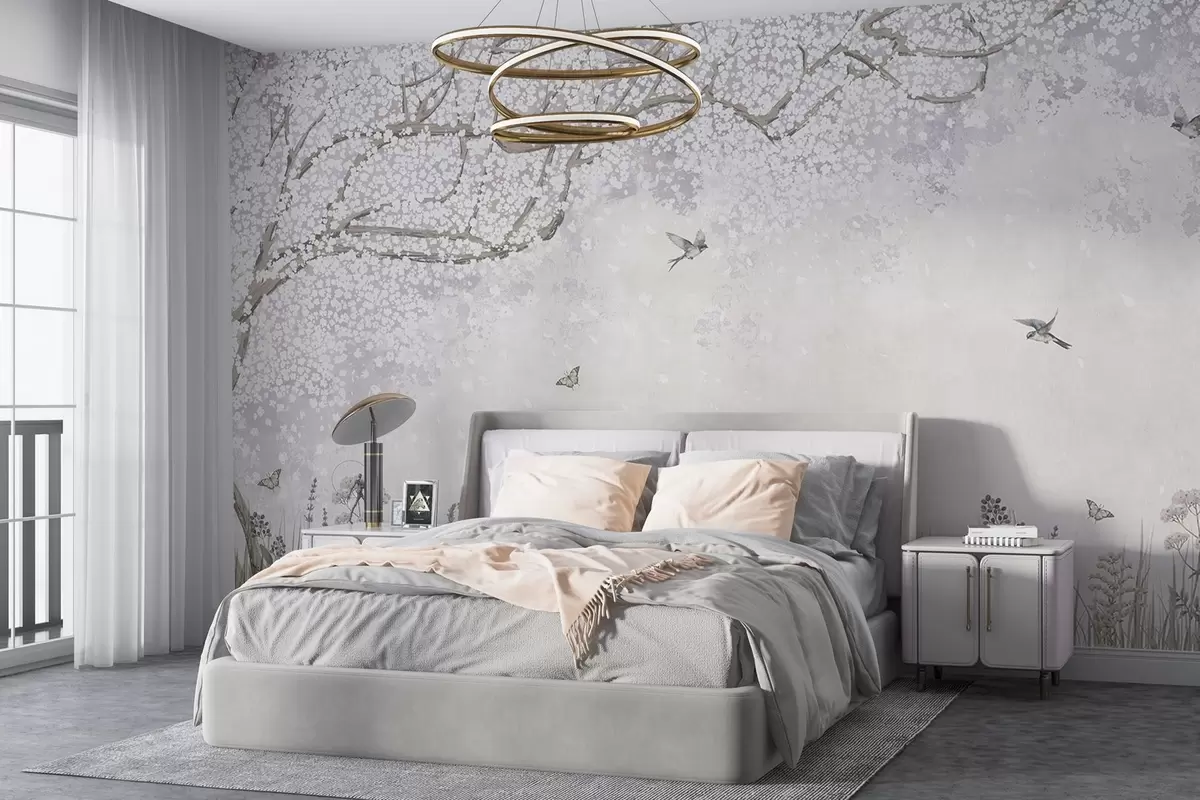 Fototapetak Virágzó fa vadvirágokkal és madarakkal Nr. w03700