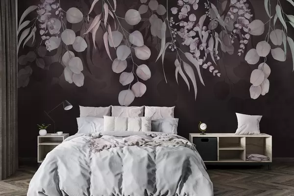 Fototapetak Trópusi levelek a sötét bordó háttéren, virágos Nr. w03752v1