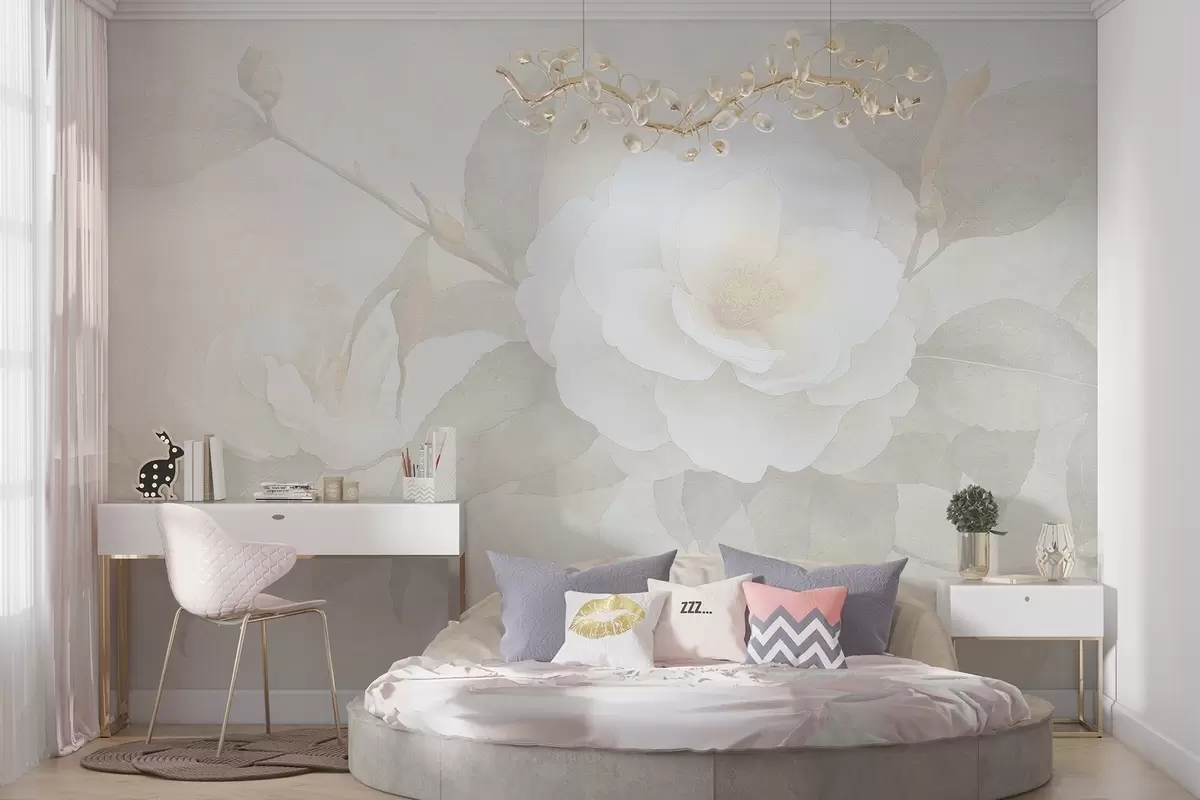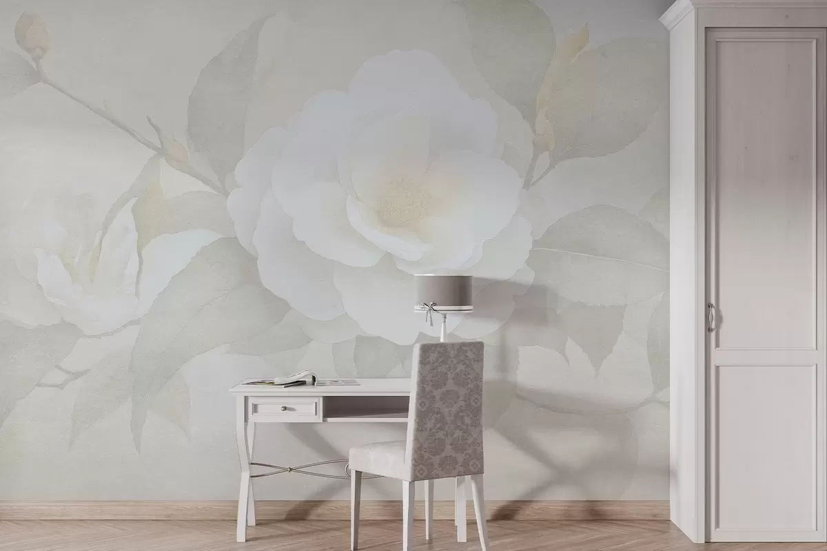 Fototapetak Lágy pasztell kamélia virágokkal az ágon, bézs színekkel Nr. w03760