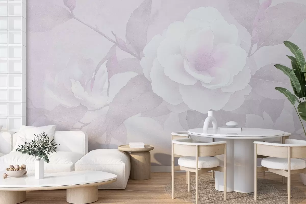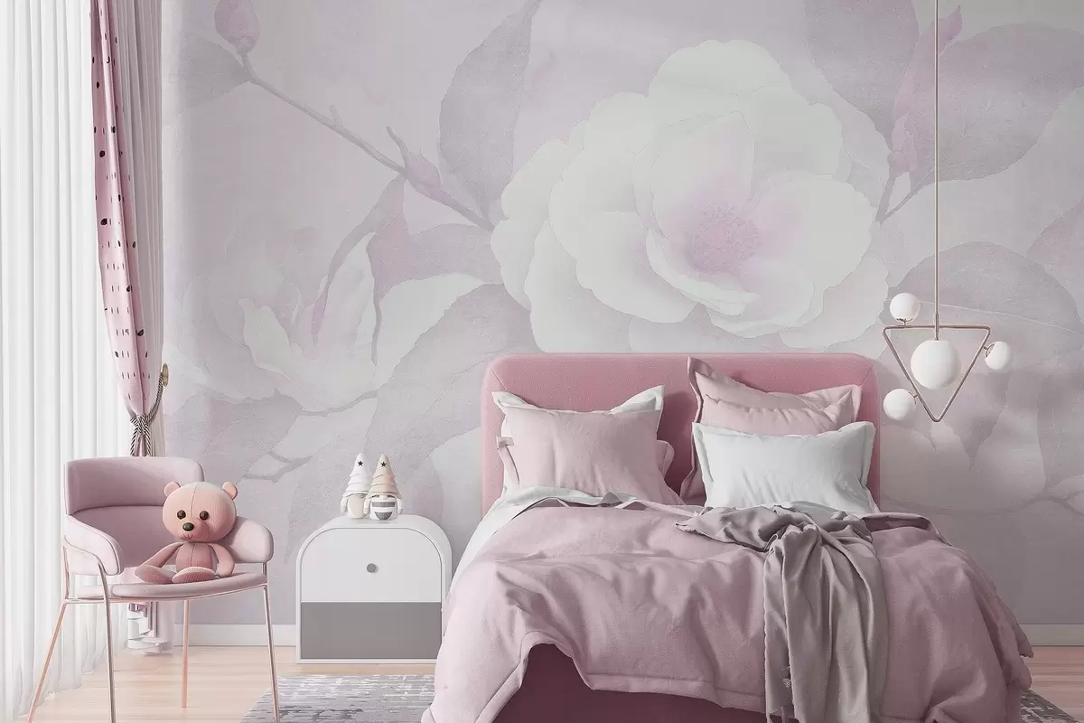 Fototapetak Lágy pasztell, kamélia virágokkal az ágon, rózsaszín színekkel Nr. w03760v2