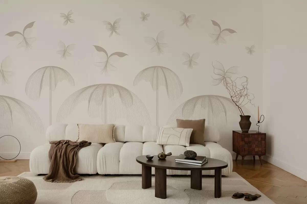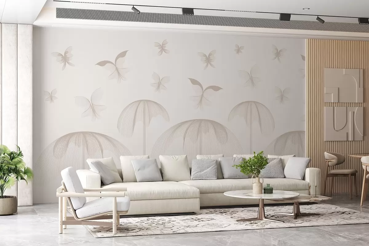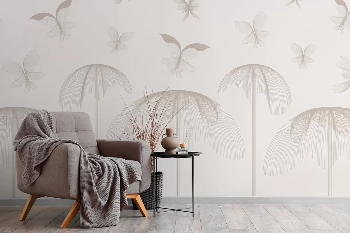 Fototapetak minimalista lineáris tapéta pillangók és szökőkutak tejes háttérrel Nr. w03762
