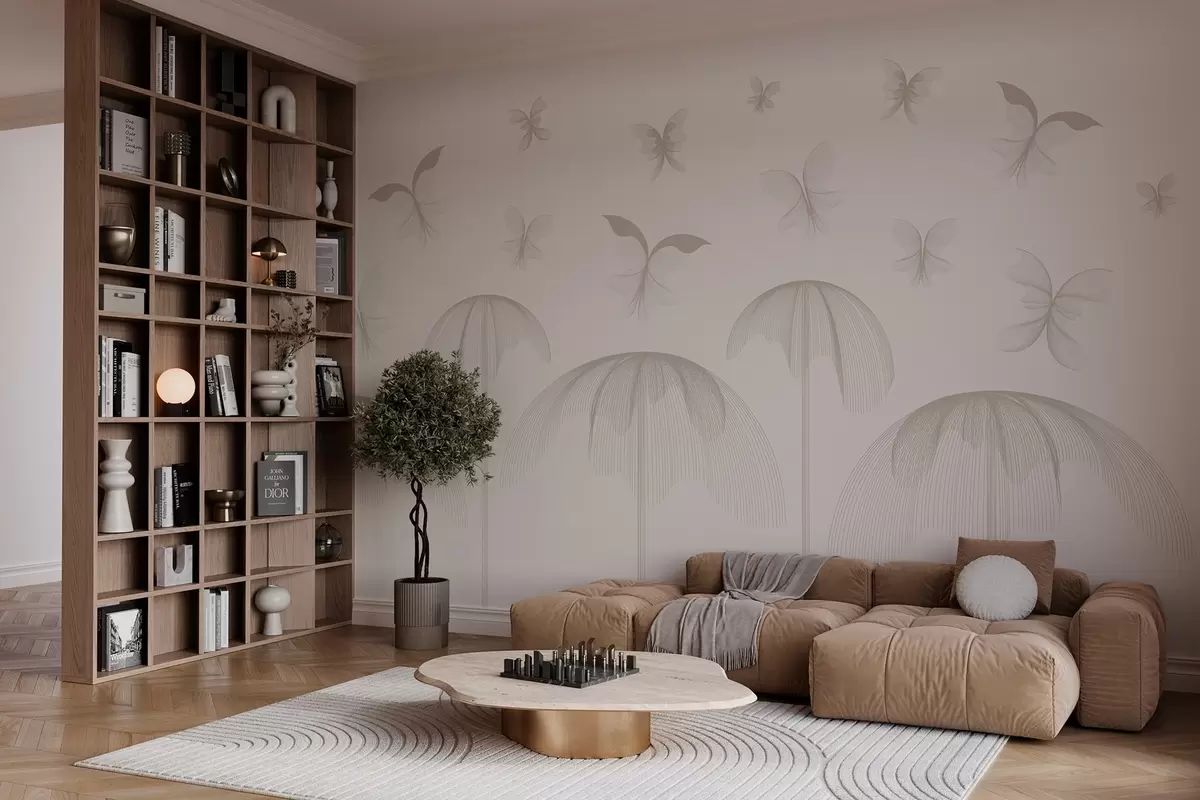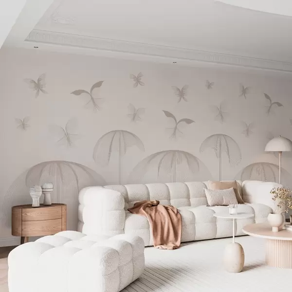 Fototapetak minimalista lineáris tapéta pillangók és szökőkutak tejes háttérrel Nr. w03762