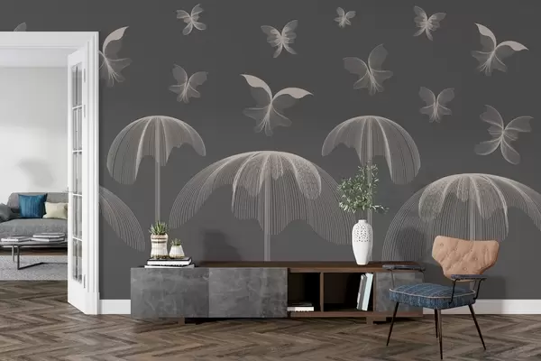 Fototapetak minimalista lineáris tapéta pillangók és szökőkutak sötétszürke háttérrel Nr. w03762v1