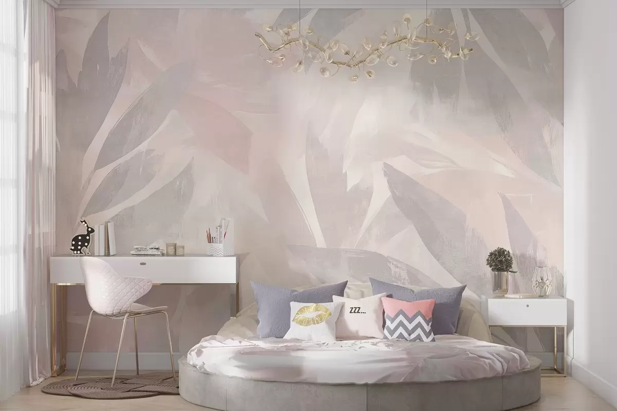 Fototapetak Trópusi levelek, virágos, pálmafák, pasztell stílus, rózsaszín és bézs színben Nr. w03881