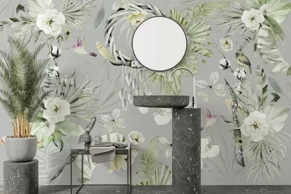 Fototapetak Boho stílusú dísz bazsarózsa virágokkal és madarakkal, akvarell stílusban, zöld színekben Nr. w03885v2