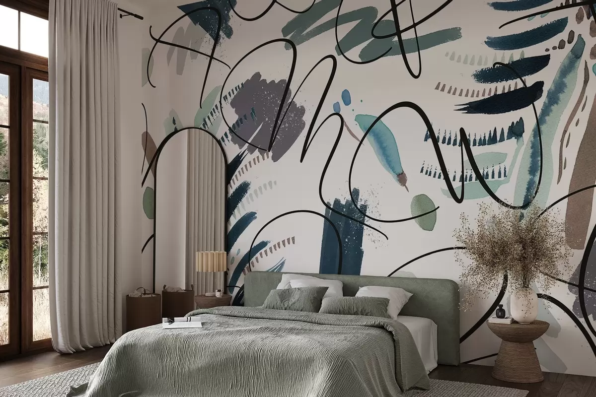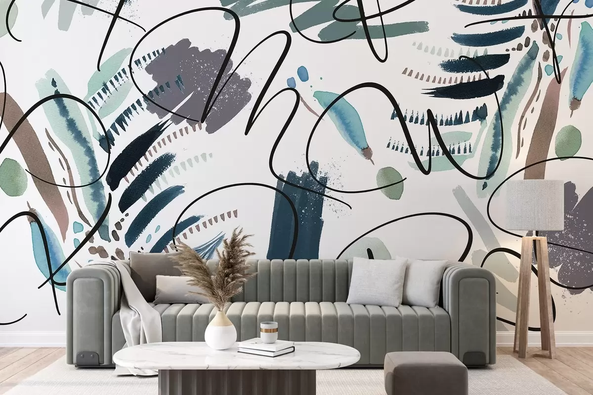 Fototapetak Tintás betűk, kalligráfia, ecsetvonások, kék színek, absztrakció Nr. w03912v2