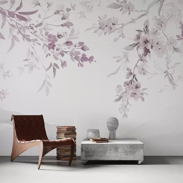 Fototapetak Virágzó ágak, vízfesték utánzat, lila-rózsaszín árnyalatok Nr. w03935v1