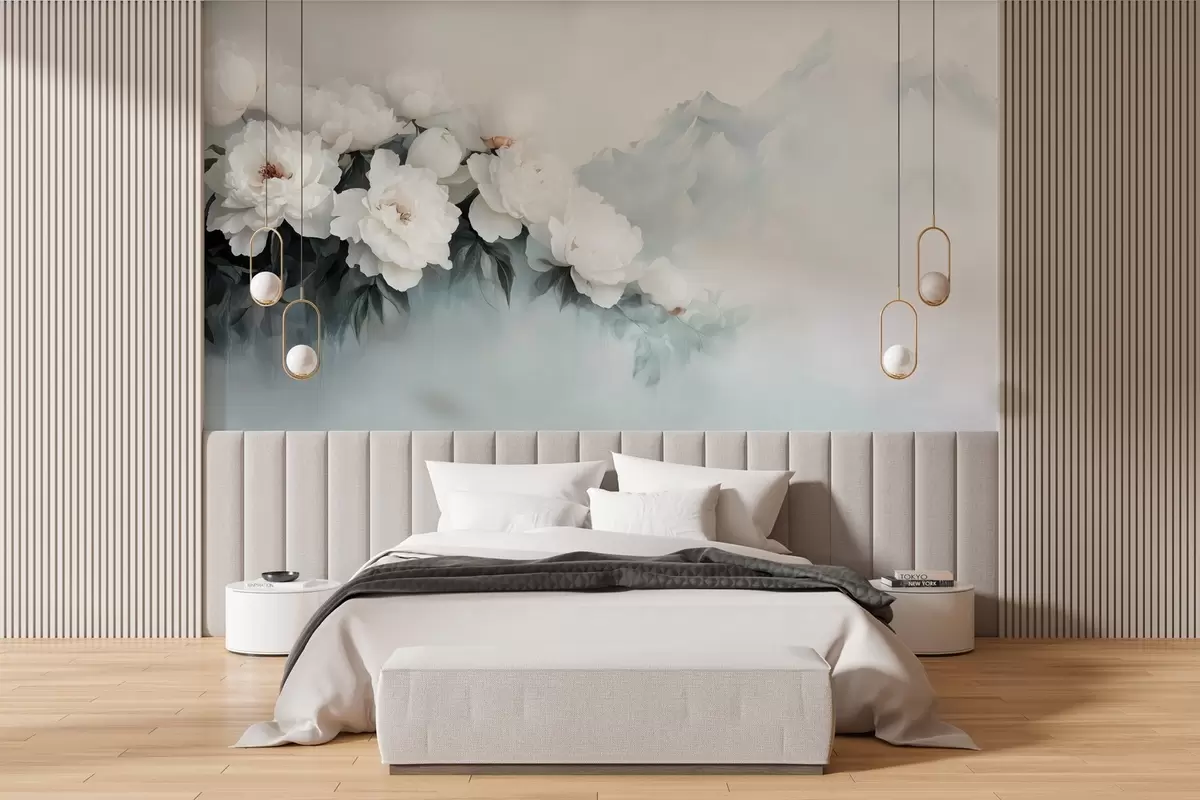 Fototapetak festői buja fehér bazsarózsák a ködös hegyek hátterében Nr. w03965
