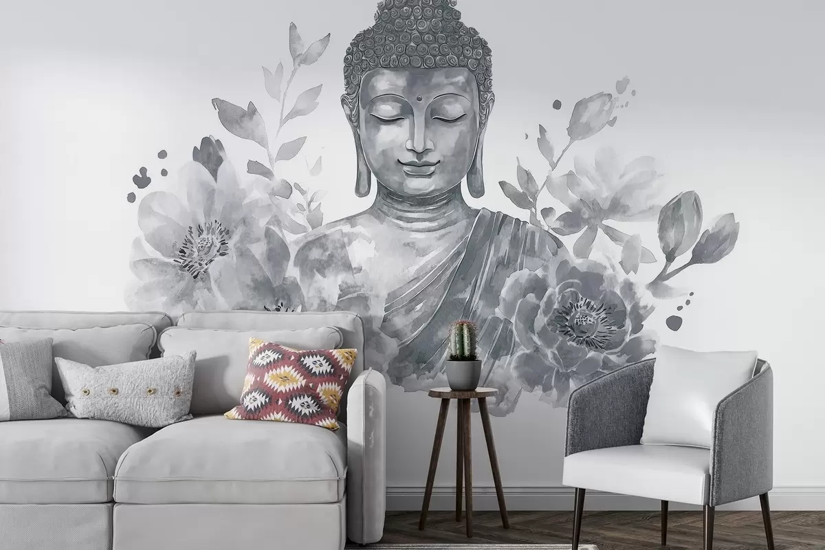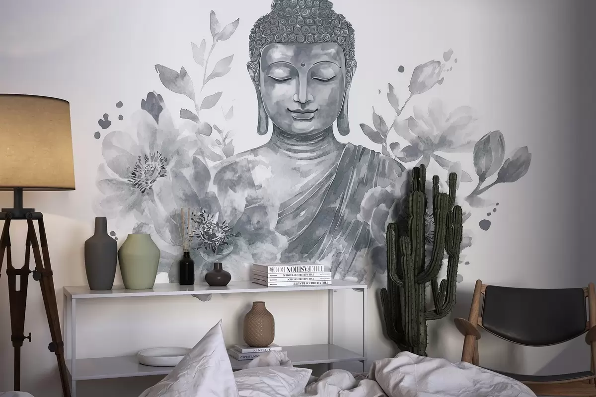 Fototapetak Akvarell Buddha virágokkal, spirituális, szürke színpaletta Nr. w04005v1