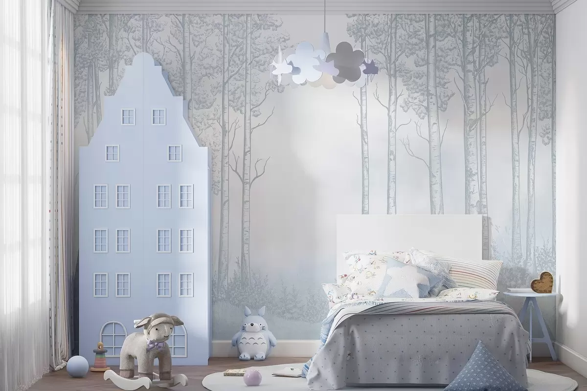 Fototapetak Erdő nyírfákkal, minimalizmus, természet, kék színpaletta, kék színpaletta Nr. w04009
