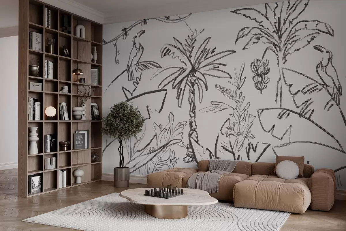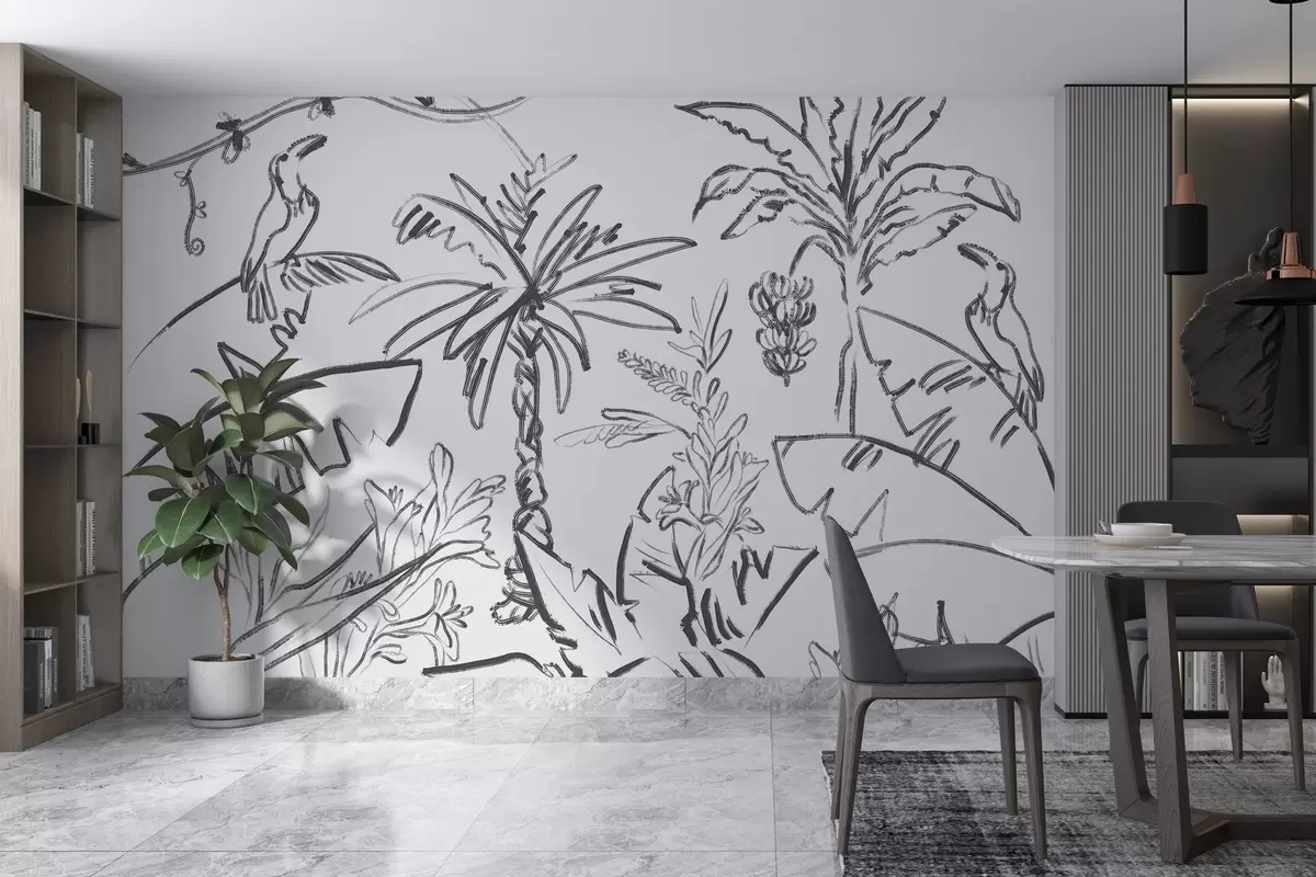 Fototapetak Trópusi vonalas rajz, banánok, pálmafák, vázlatos grafika Nr. w04020