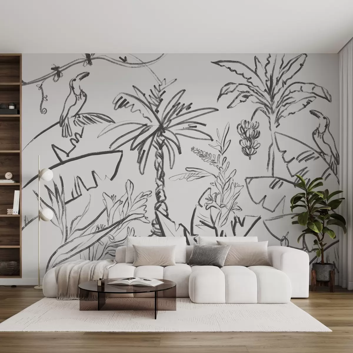 Fototapetak Trópusi vonalas rajz, banánok, pálmafák, vázlatos grafika Nr. w04020