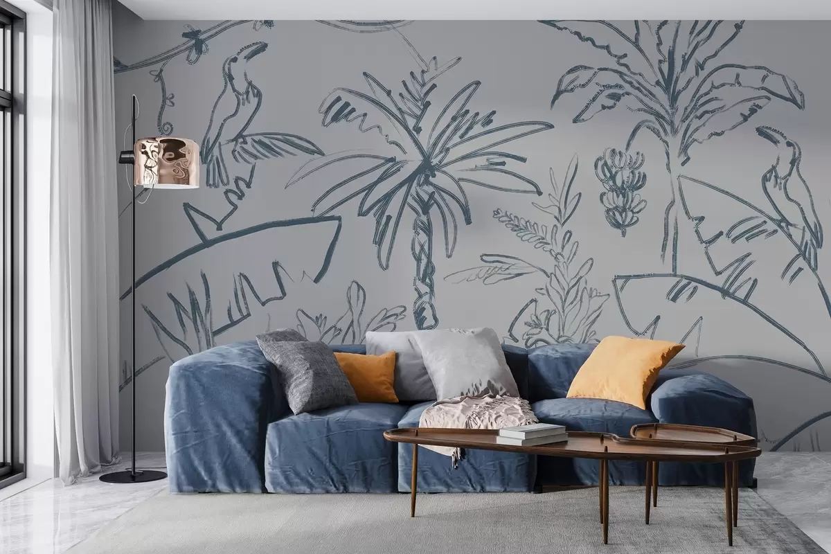 Fototapetak Trópusi minta kék színben, banánok, pálmafák Nr. w04020v1