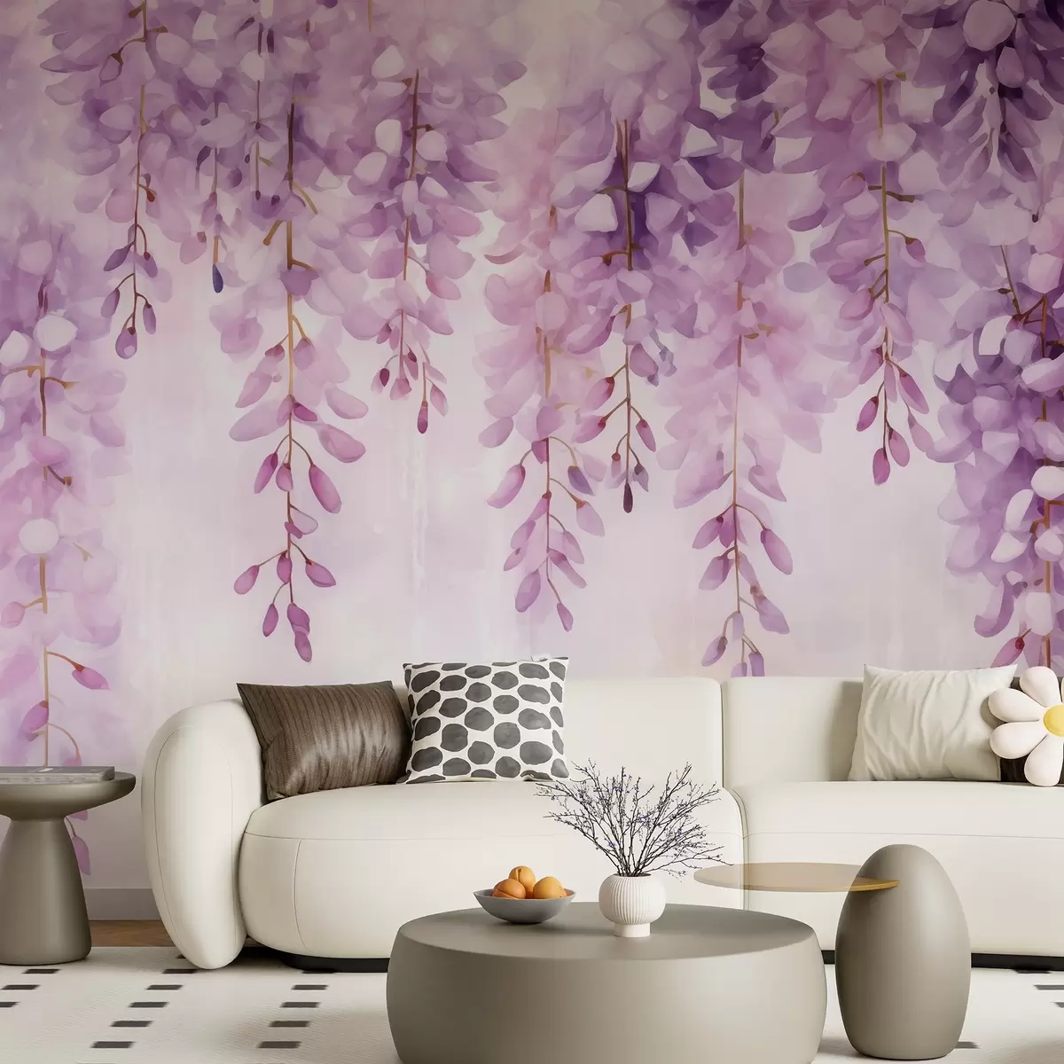 Fototapetak Finom akvarell kompozíció, lágy levendula és rózsaszín tónusú, kaszkádszerűen hullámzó fűzfával, amely békés hangulatot teremt, Nr. w04034