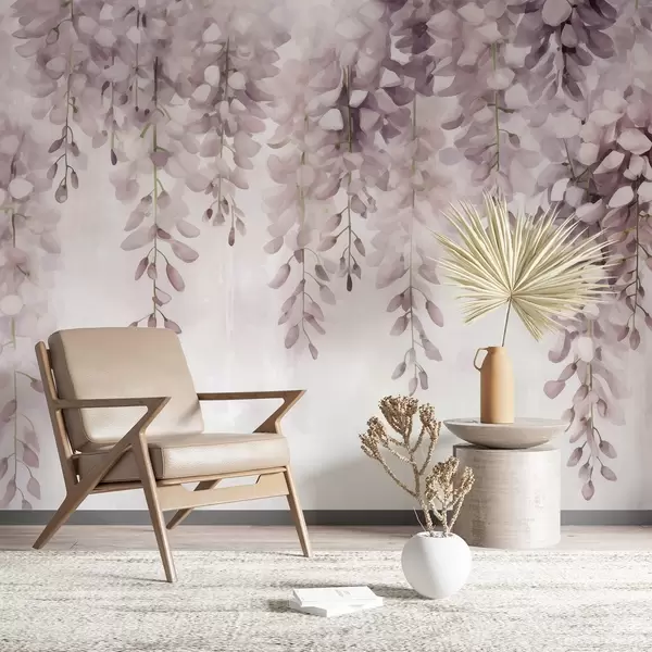 Fototapetak Lágy akvarell jelenet krémes rózsaszín tónusokban, álomszép virágos függönyt alkotó, kaszkádszerűen hullámzó golgotavirág fürtökkel Nr. w04034v2