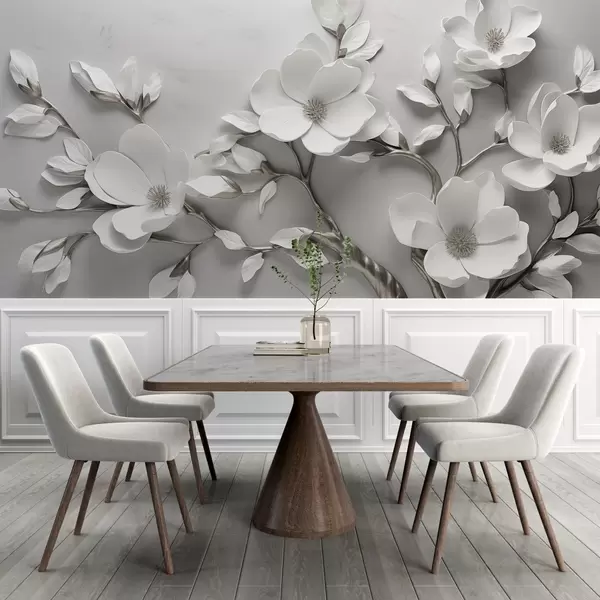 Fototapetak Dimenzionális virágos ág tiszta fehérben és semleges tónusokban Nr. w04039v2