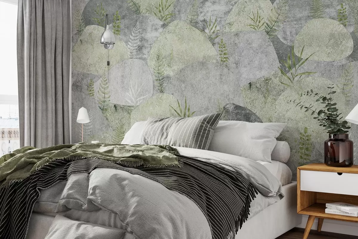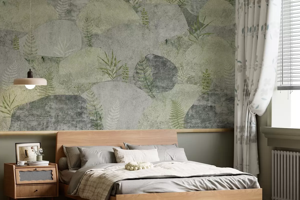 Fototapetak Kövek növényekkel, páfrány, északi, rusztikus stílus, szürke és zöld színek Nr. w04064v2