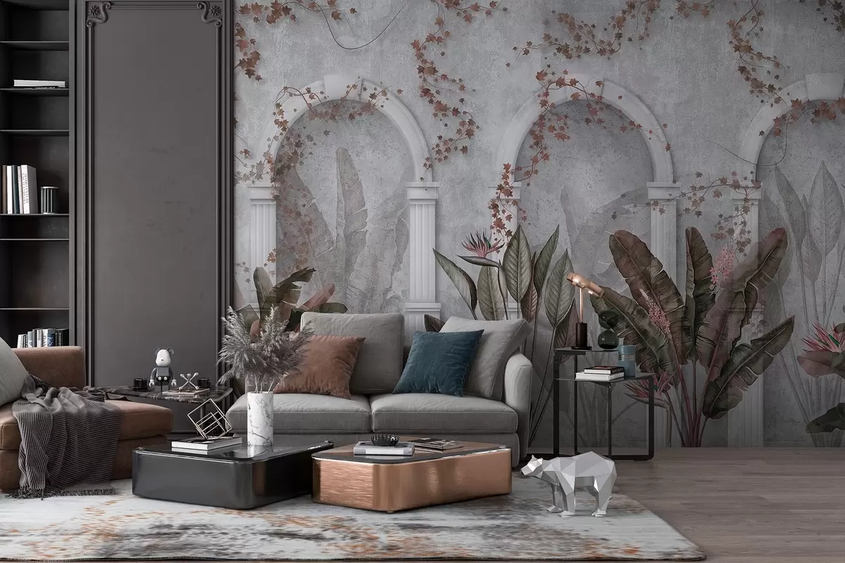 Fototapetak Betonfal boltívekkel és trópusi növényekkel, virágos, bordó színekkel Nr. w04065v1