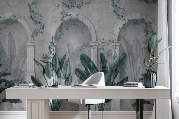 Fototapetak Betonfal boltívekkel és trópusi növényekkel, virágos, kék színekkel Nr. w04065v2
