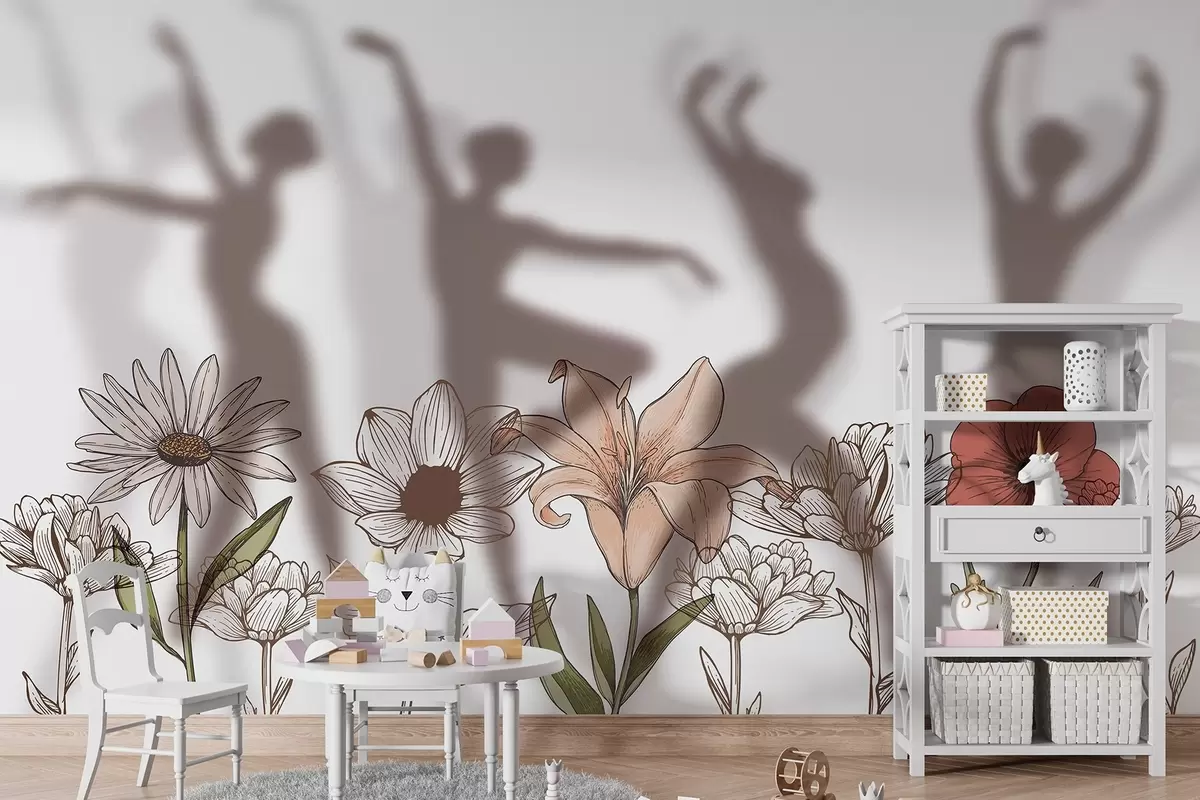 Fototapetak Balerinák sziluettjei, rusztikus virágok, line art, piros és bézs színek Nr. w04069