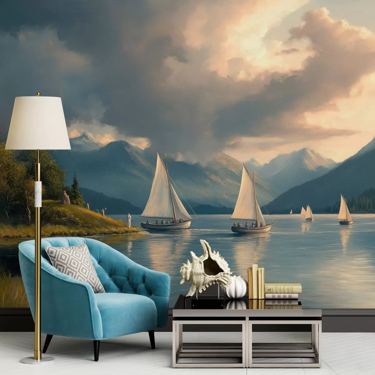 Fototapetak regatta egy tavon, felhős égbolton, 19. századi olajfestmény stílusában Nr. w04076