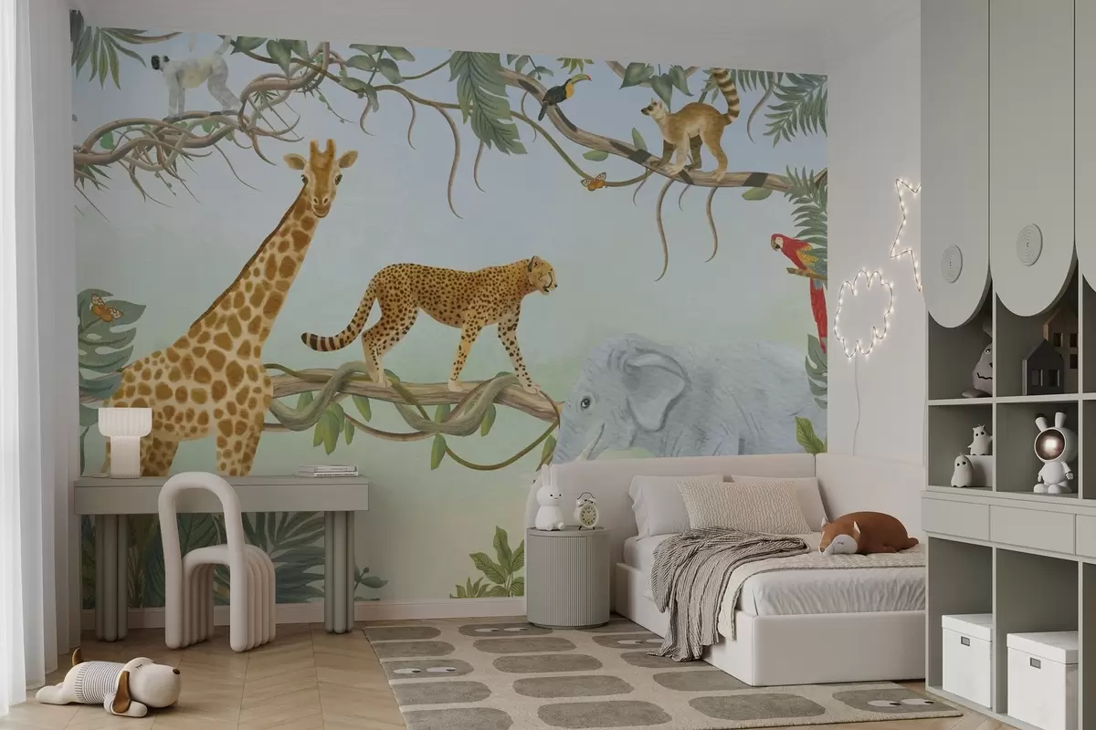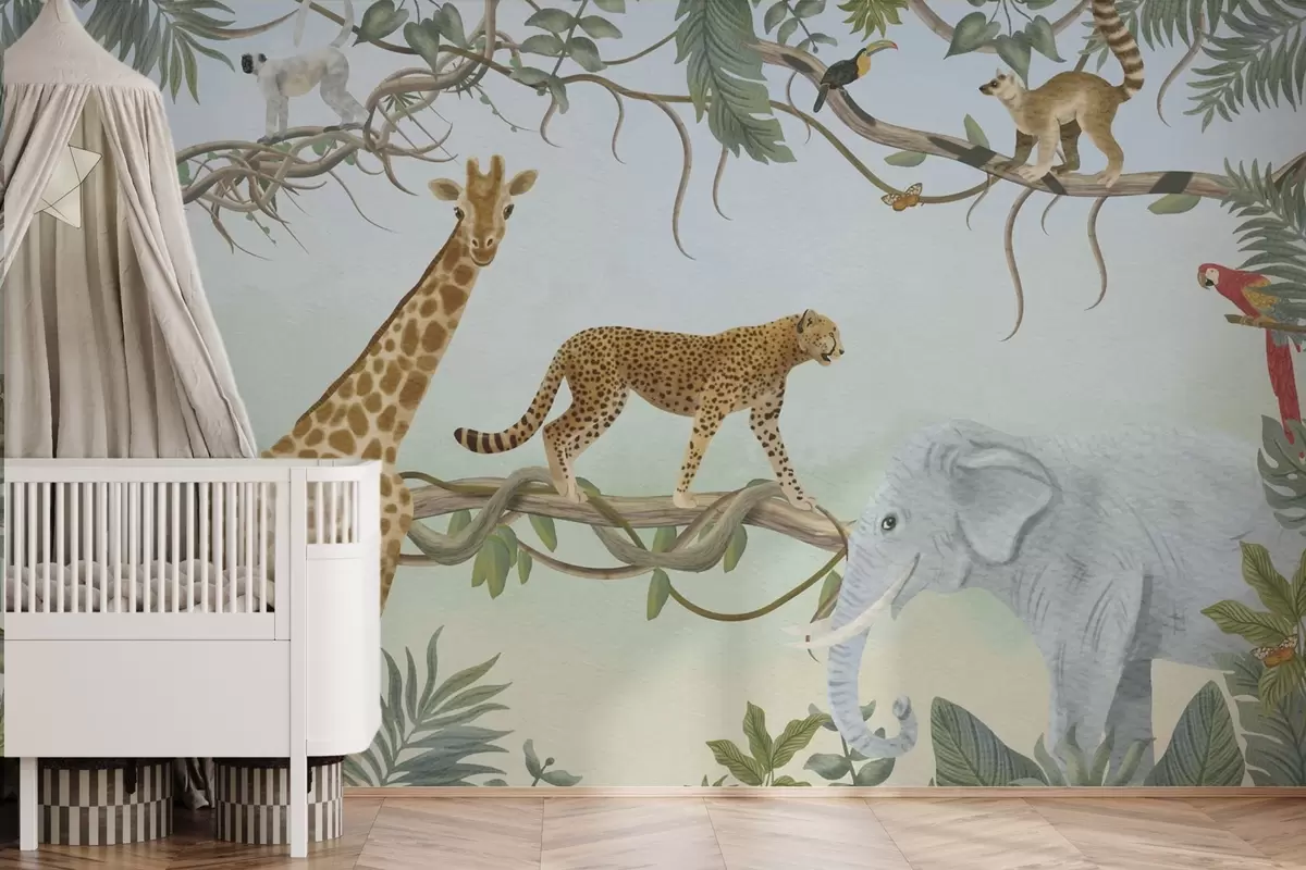 Fototapetak Dzsungel illusztráció zsiráffal, gepárddal és elefánttal Nr. w04194