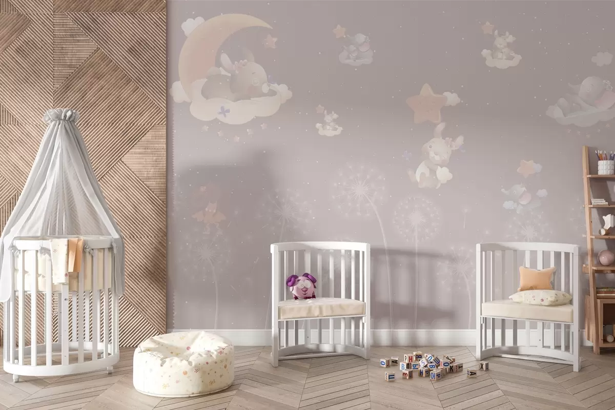 Fototapetak Tündérmese éjszaka nyúllal és pitypanggal rózsaszín háttéren Nr. w04195v2