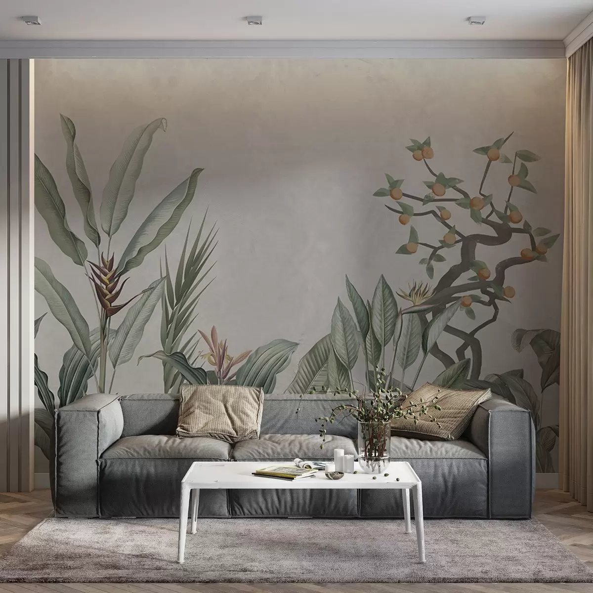 Fototapetak Trópusi kompozíció növényekkel és fával szürkés háttéren Nr. w04201v1