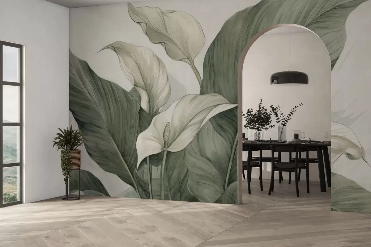 Fototapetak Közelkép a virágzó spathiphyllumról nagy levelekkel Nr. w04263