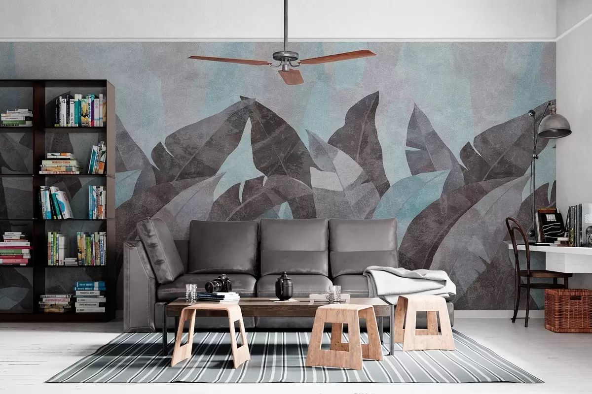 Fototapetak texturált banánlevelek a kék és a szürke árnyalataiban Nr. w04285v2