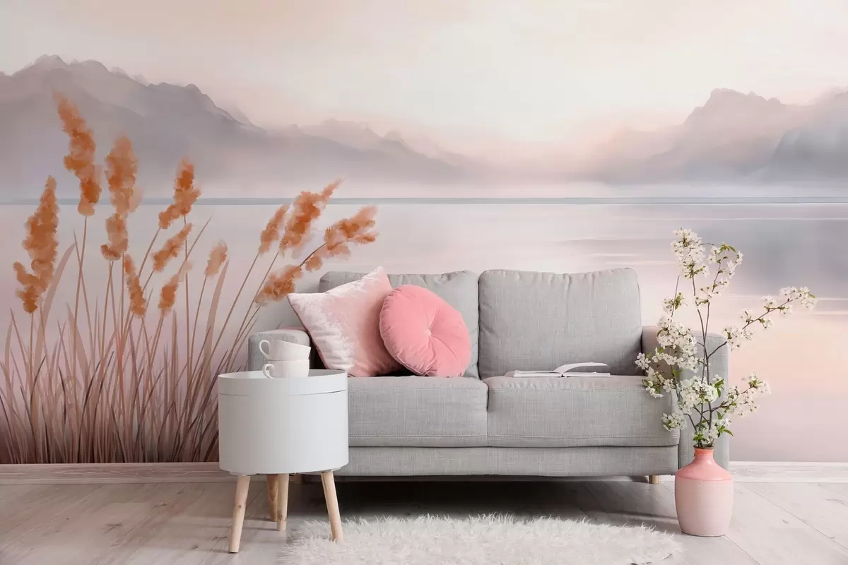 Fototapetak egy festői tó nádasokkal és hegyekkel Nr. w04315