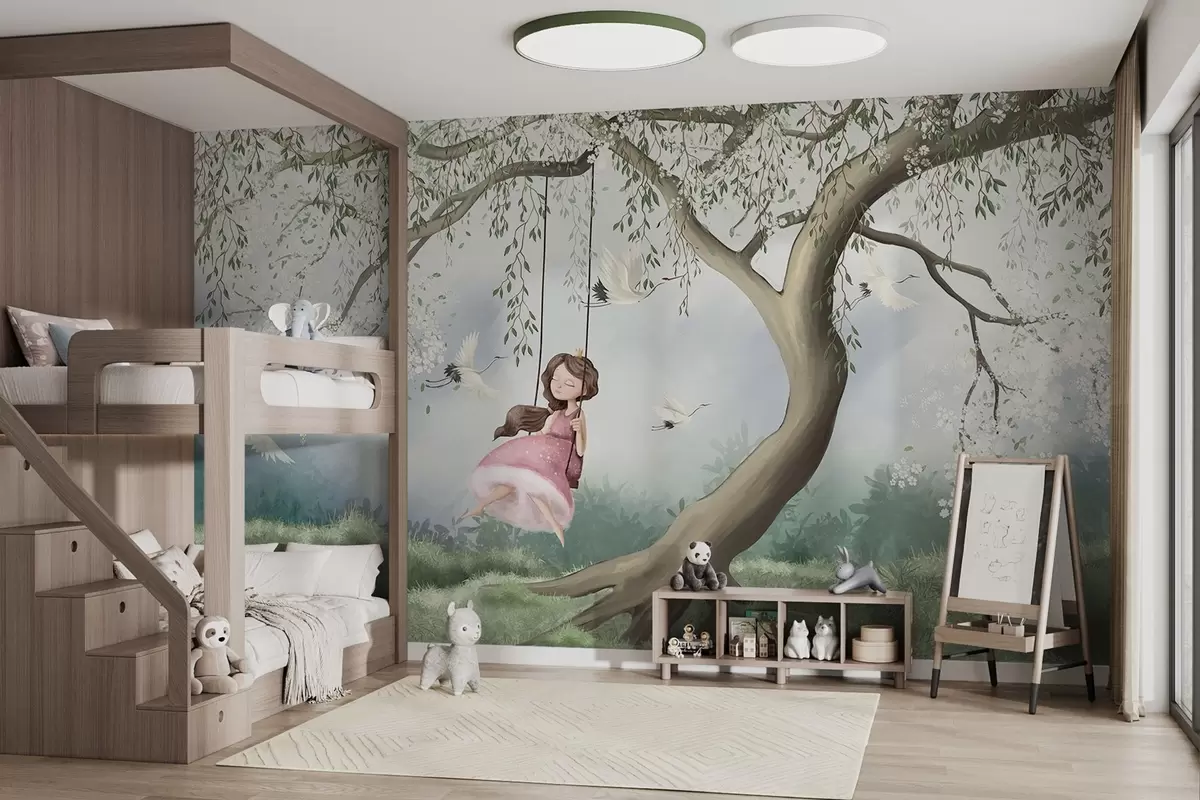 Fototapetak Lány hintán virágzó fa alatt, körülötte madarak repkednek Nr. w04370